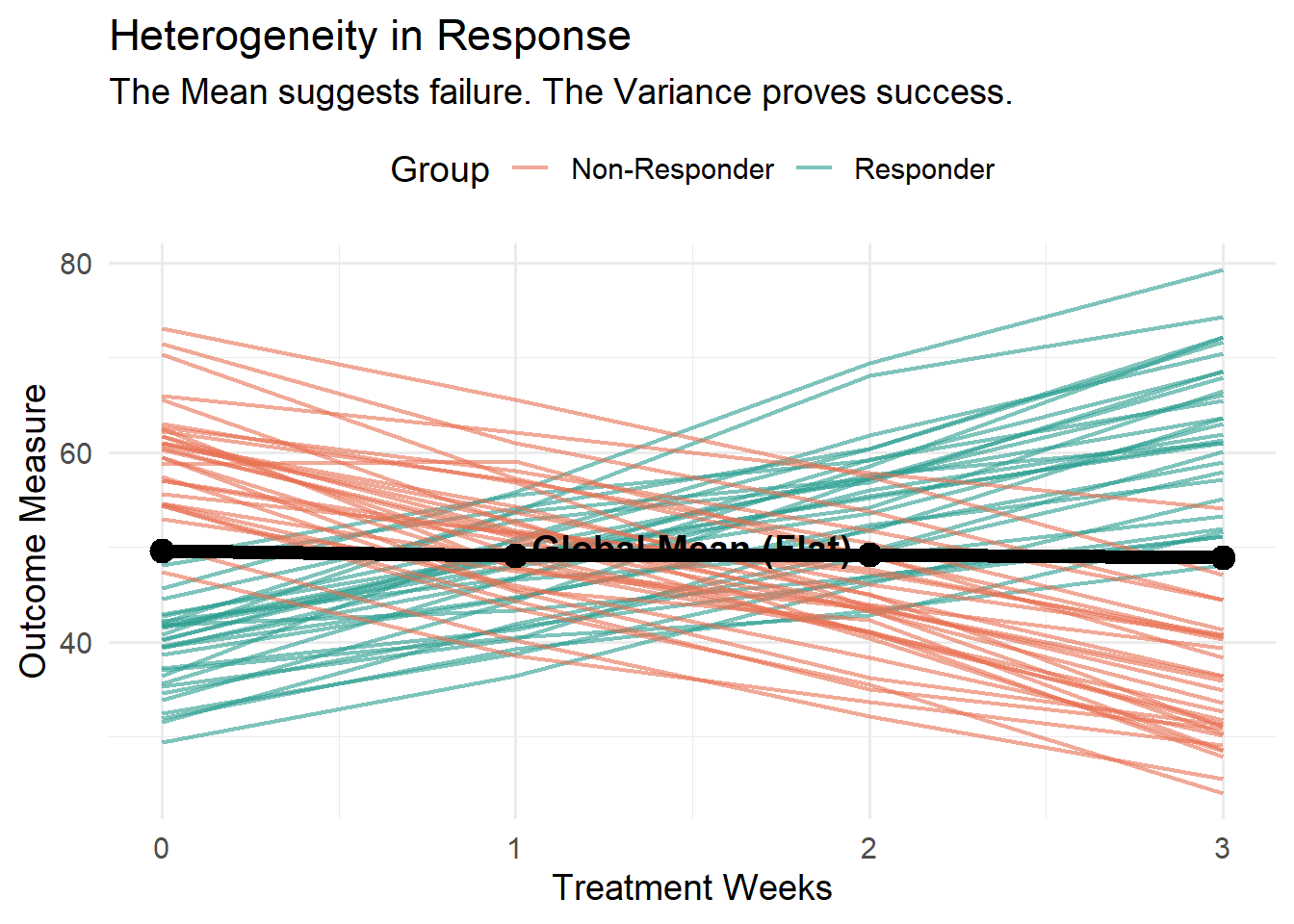 p <-ggplot(data, aes(x = Time, y = Score)) +# Individual Trajectories colored by hidden groupgeom_line(aes(group = ID, color = Group), alpha =0.6, linewidth =0.8) +# The Group Mean (The Aggregate)geom_line(data = mean_trend, color ="black", linewidth =2.5) +geom_point(data = mean_trend, color ="black", size =4) +annotate("text", x =1.5, y =50, label ="Global Mean (Flat)", color ="black", fontface ="bold", size =5, fill="white", label.size=NA) +scale_color_manual(values =c("Non-Responder"="#E76F51", "Responder"="#2A9D8F")) +theme_minimal(base_size =14) +theme(legend.position ="top") +labs(title ="Heterogeneity in Response",subtitle ="The Mean suggests failure. The Variance proves success.",y ="Outcome Measure", x ="Treatment Weeks")# Display plotprint(p)# SAVE THE IMAGE for the Blog Listing (Fixes broken image link)ggsave("preview.png", plot = p, width =8, height =6)
